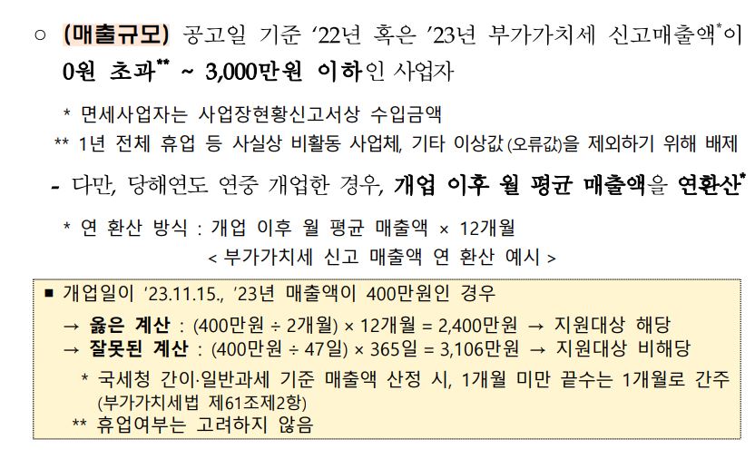 *매출 규모는? 공고일 기준으로 2022년이나 2023년 부가가치세 신고매출액이 0원~3000만원 이하인 사업자입니다.