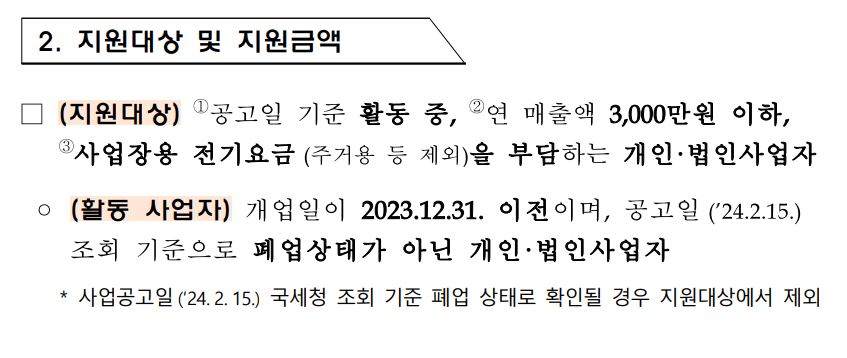 □ 지원대상은 ①공고일 기준 '활동사업자'입니다. ②연 매출액 3000만원 이하인 소상공인이 대상이고요. ③사업장용 전기요금(주거용 등 제외)을 부담하는 개인이나 법인 사업자가 받을 수 있어요.