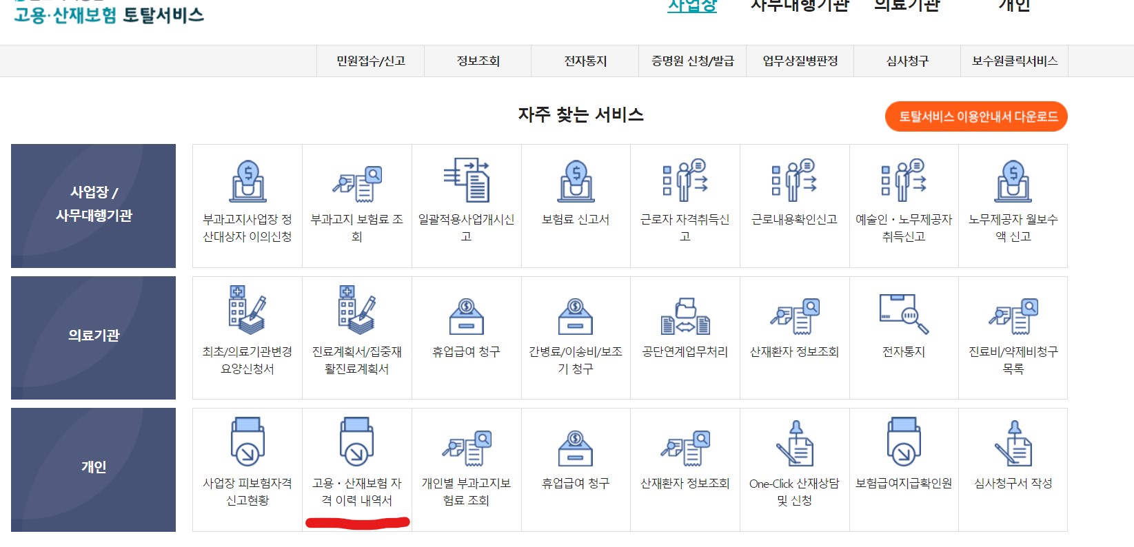 먼저, 고용산재보험토탈서비스 웹사이트에 접속합니다. 페이지에 들어가면 '개인' 항목 아래에 '고용 산재보험 자격 이력 내역서'를 찾을 수 있습니다. 이를 클릭하면 로그인 페이지로 이동합니다.