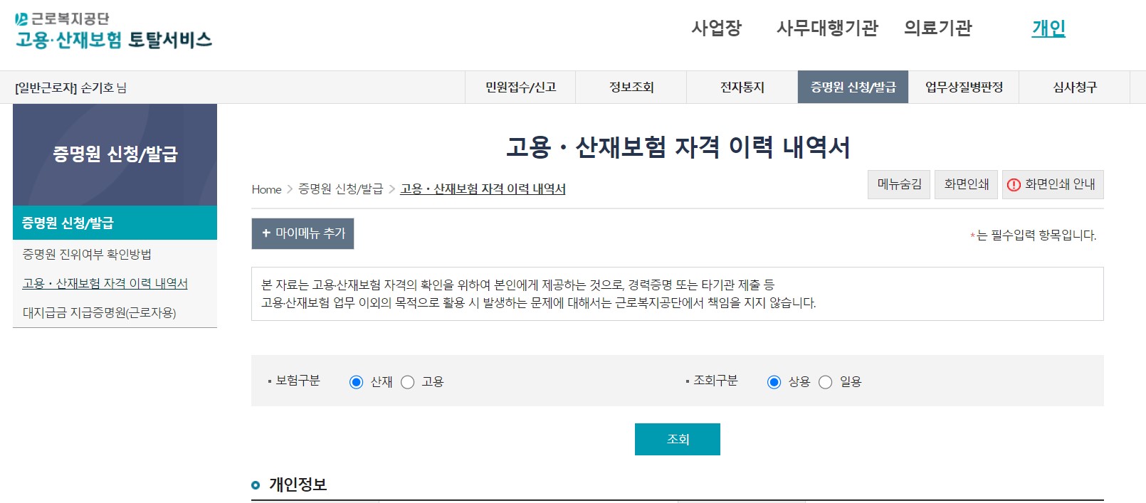 고용산재보험토탈서비스에서 '개인 - 고용 산재보험 자격 이력 내역서'를 클릭하고 로그인하면, 해당 페이지로 이동합니다. 여기서 산재와 고용을 선택하여 자신의 근무 이력을 조회할 수 있습니다. 산재와 고용 항목을 클릭하면, 자신이 근무했던 회사명과 연도 등을 상세히 확인할 수 있습니다.