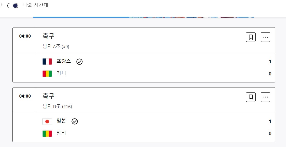 아래는 7월28일 프랑스와 일본의 각각 경기였습니다. 프랑스는 기니를 1:0으로 이겼고, 일본은 말리를 1:0으로 이겼습니다.